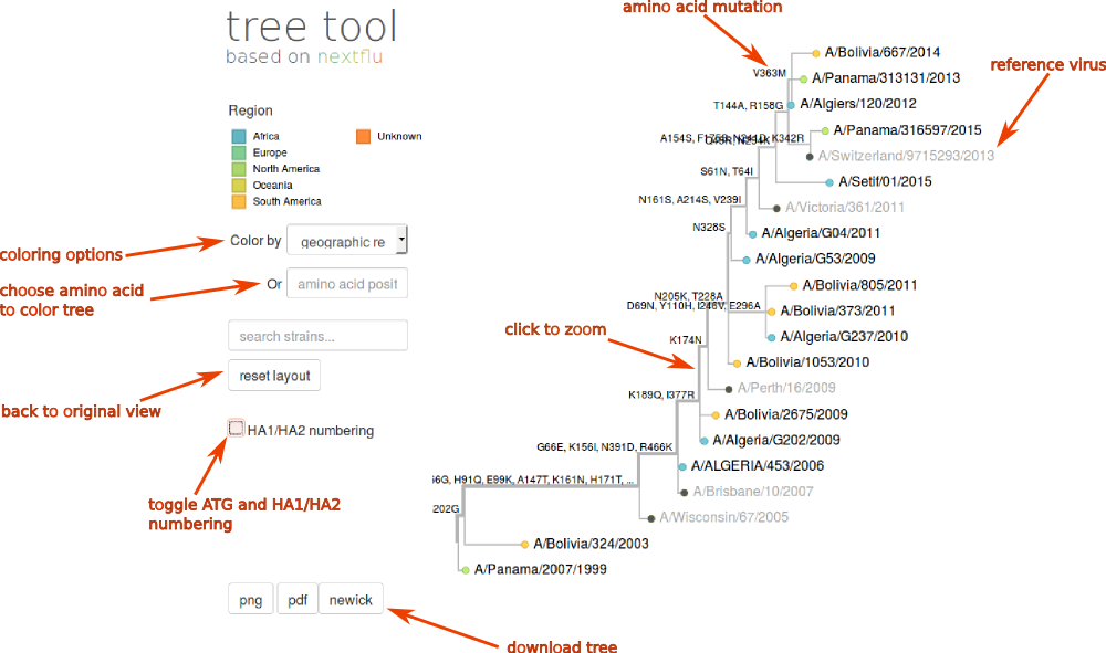 The screen shot below gives and overview over some of the features of nextflu tree viewer. The tree is annotated with amino acid changes that occur on different branches. The annotated tree can be downloaded as png or pdf images or as a newick tree file (buttons below the tree). For HA segments, the user can toggle (by ticking the box) between HA1/HA2 numbering according to the mature cleaved HA1/HA2 protein, or according to the full length HA0, starting with the initiating ATG codon.