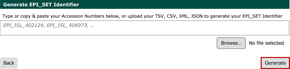 Registered Users may generate an EPI_SET ID in myriad ways via the “Search” interface in the EpiCoV™ database. Clicking the “EPI-SET” button displays the EPI-SET generator where users may type, paste, or upload (available formats .tsv, .csv, .xml, and .json) any number of GISAID Accession Numbers. It is also possible to pre-populate the EPI-SET generator by first ticking the checkbox(es) of the desired sample(s). Available search filters may be pre-applied to narrow the universe of suitable records. Clicking on “Generate” will start generate an EPI_SET ID.