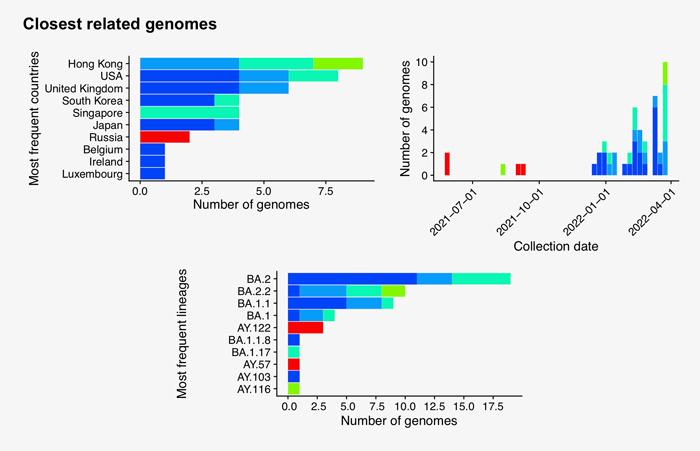 Searching the 77 new hCoV-19 genome sequences with GISAID’s AudacityInstant against the 10.6 million genomes in the EpiCoV database found a total of 16,278 closely related genomes. The graphic below shows the distribution of countries of the closest hits of which the dark blue bars correspond to identical sequence hits from abroad and possible transmission links: